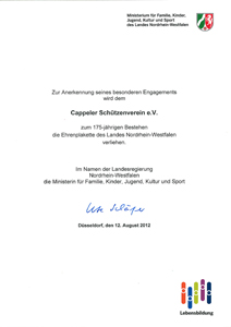 Auszeichnung geehrt, die das Land Nordrhein-Westfalen an Schützenvereine zu vergeben hat. Oberst und