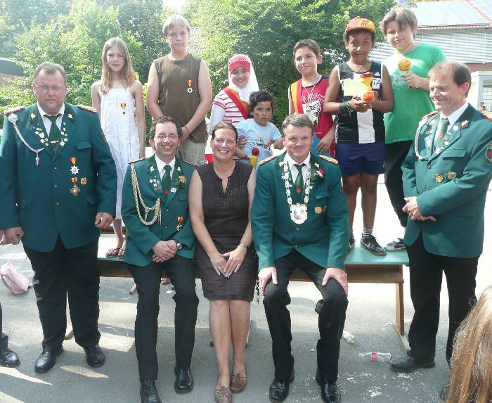 obere Reihe vlnr: ehem. Kinderkönigin Esther Kersting, ehem Kinderkönig Paul Musshof, Kinderkönigspaar Duwaa Ismail und Ali Ismail, Kronprinz Ibrahim Drame, und Apfelprinz Toni Dietrich